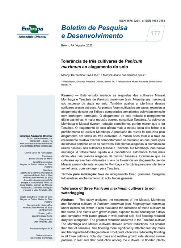 Resumo — Este estudo analisou as respostas das cultivares Massai, Mombaça e Tanzânia de Panicum maximum (syn. Megathyrsus maximus) sob excesso de água no solo. Também avaliou a tolerância dessas